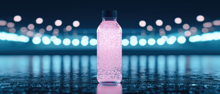 A clear sports drink bottle showcases vibrant pink and blue liquid within, set against a gradient background. The atmosphere feels refreshing, ideal for hydration after sports activities.