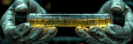 In the image, a human is gripping a test tube containing a yellow liquid. The scene incorporates elements like water, science, fluid, glass, and metal, with reflections visible