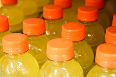 A closeup shot of orange juice in plastic bottles
