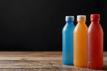 Colored plastic bottles with drinks on wooden table. Black background.