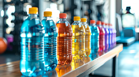 Assortment of plastic water bottles on gym bench. Concept of hydration, fitness, health, sports drinks.