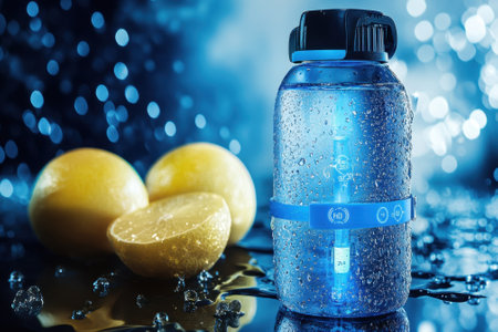 A blue water bottle glistens with condensation next to fresh lemons on a wet surface, creating a refreshing atmosphere.