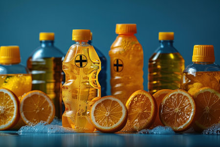 An assortment of citrus fruit and cleaning supplies including dish soap and laundry detergent in various orange-hued bottles on a blue background.