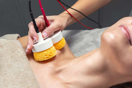 Macro close up portrait of woman having cosmetic galvanic beauty treatment in spa.Therapist applying low frequency current with electrodes on face.