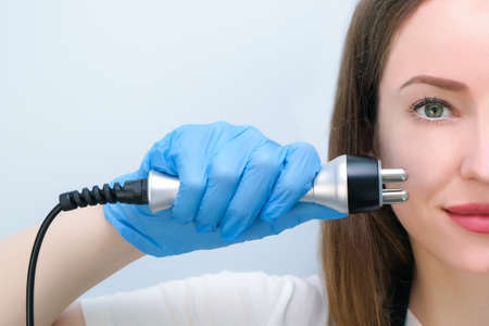 Doctor performs cosmetic spa procedure RF lifting electric facial massage for skin of young woman face