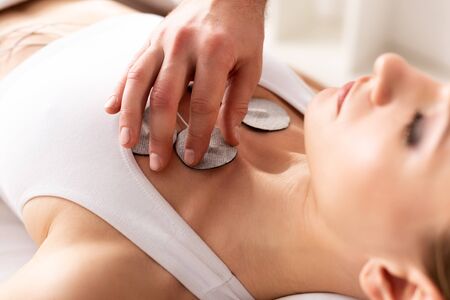Close-up Of A Therapist's Hand Placing Electrodes On Young Woman's Chest