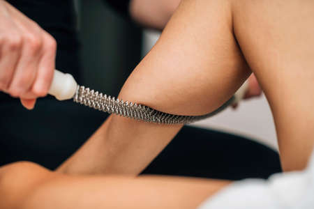 Skin and body care. Woman receives an electric massage against cellulite. Close-up of the apparatus massages legs of woman.