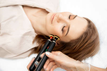 Lateral view of woman facial massage spa procedure. Electric stimulation facial skin care. Microcurrent lift face. Beauty spa procedure. Anti aging rejuvenation non surgical treatment in medical interior room