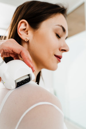 cosmetician hands make laser hair removal depilation procedure on woman neck closeup photo