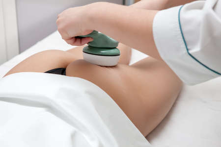 procedure removing cellulite on female abdomen, cavitation belly massage. Ultrasonic massage for weight loss. Correction of female figure without surgical intervention. Closeup of the tummy.