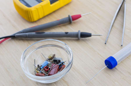 The radio parts in the glassy saucer on the wooden table. Workplace. Angle view.