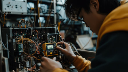 A young engineer is focused on troubleshooting a complex circuit board with a multimeter in a busy workshop, showcasing hands-on skill and innovation.