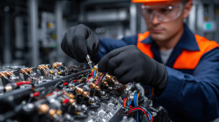 Skilled electrician focused on connecting wires in a bustling workshop, embodying craftsmanship and dedication amidst tools and machinery.