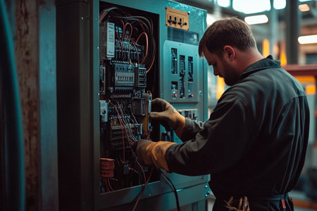An electrician focuses on maintaining complex electrical systems within a factory, surrounded by heavy machinery. The environment is well-lit, emphasizing the technical work being performed.