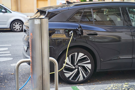 Vienna, Austria - October 12, 2022: Electric cars charging at charging station outdoors