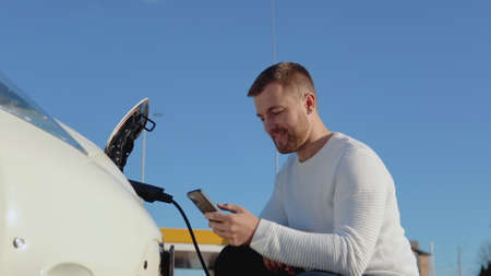 A fair-skinned male driver connects an electric car to the power system to charge the car battery and controls the charging process via his smartphone