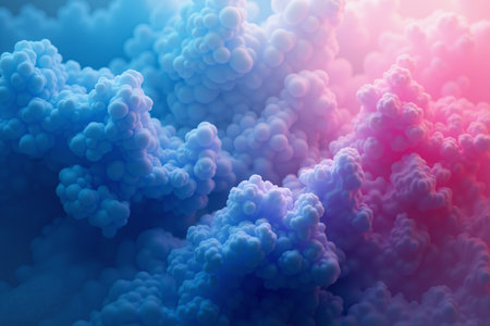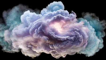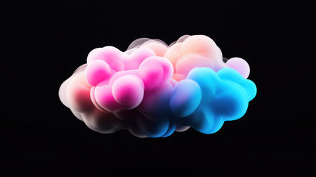 A vibrant and artistic depiction of a cloud-like structure with a gradient of pink, blue, and peach hues against a stark black backdrop.