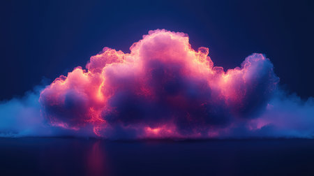 Colorful cloud glowing with orange light floating over dark water reflecting lights, futuristic cloud computing concept