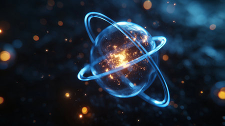 An abstract depiction showcases a glowing atom structure, rendered with intricate details and a luminescent quality. The image features a dark background, complemented by bokeh effects that add depth and visual interest. Suitable for various applications, this image offers potential use in presentations or design projects.
