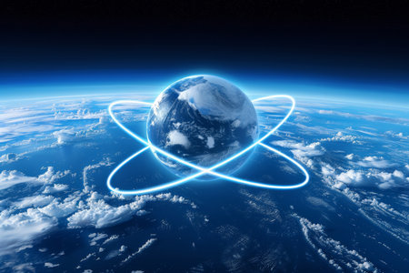 An illustration depicts a satellite in orbit around Earth, showcasing the planet's atmospheric features. The image presents a dark, space environment with the illuminated Earth. This visual could be used in projects related to technology, communications, or scientific research. The image displays a sense of innovation.