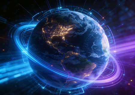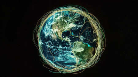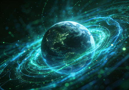 3d rendering of planet earth with glowing lines and particles on dark background