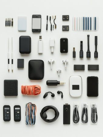 Flat lay image of charging devices for smartphones, laptops, and gadgets, conveying convenience and innovation, perfect for charging device manufacturers.