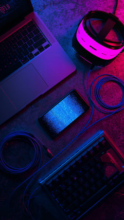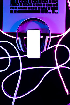 Image of headphones, laptop and smartphone with copy space over neon strands in background. Technology, music, light and colour concept.