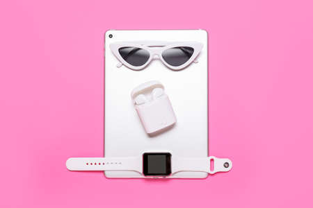 Tablet computer, smart watch, earphones and sunglasses on pink background