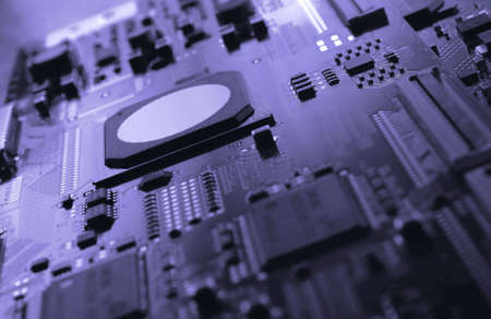 Closeup on electronic board in hardware repair shop, blurred and toned image. Shallow DOF, focus on the middle left field