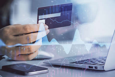Double exposure of man hands holding a credit card and Forex graph drawing. Stock trading and digital fintech in Internet E-commerce concept.