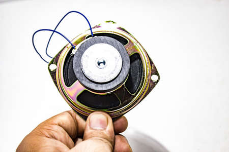 Old speaker removed from the radio. Electronics from old electronic devices. Dark background.