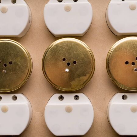 Rovigo, Italy 18 December 2025: array of vintage power control switches on an aged wall panel, illustrating concepts of electricity management and outdated technology