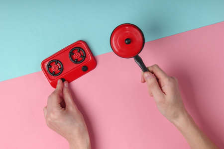 Female hand holding mini toy pan and stove on pink blue pastel background. Top view