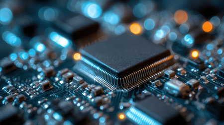 Close-up of a microchip on a circuit board with intricate details and glowing blue and orange lights, emphasizing technology and electronics. No text is visible in the image
