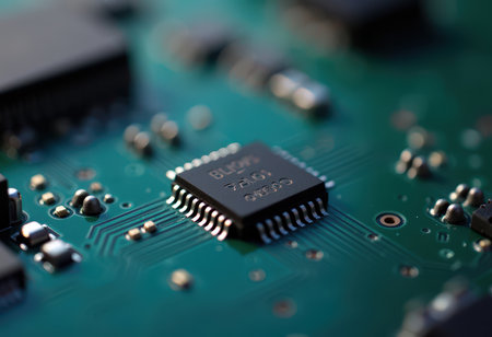 Detailed macro shot of electronic circuit board with microchips and technology components