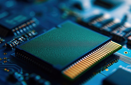 This close-up image showcases a central processing unit mounted on a circuit board, featuring a gold heat sink and various electronic components. It highlights intricate details and technological precision.