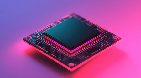 This stunning close-up image features a computer chip illuminated by vibrant LED lights on a circuit board, showcasing the intricate details of modern technology.