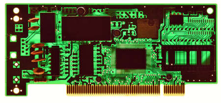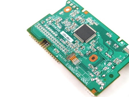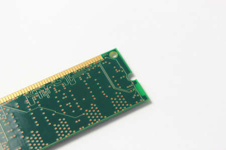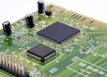 Macro photo of a green computer printed circuit board with selective focus on an blank chip