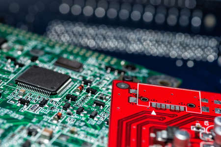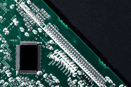 Computer Microchips and Processors on Electronic circuit board. computer hardware technology. Abstract technology microelectronics concept background. Macro shot, shallow focus.