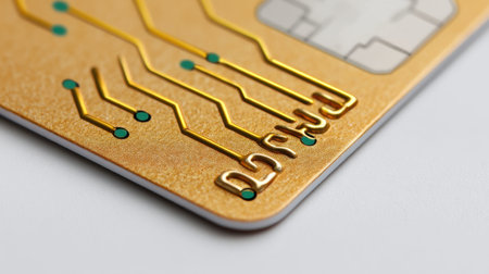 Detailed close-up of an electronic circuit on a smart card showcasing its gold plating, microchip, and fine connections, highlighting modern technology in the payment sector.