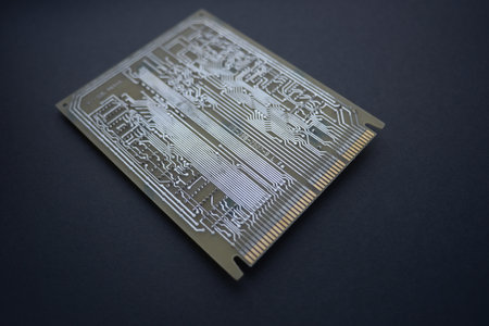 Close up view of black pcb with gold connectors, technology concept horizontal banner design