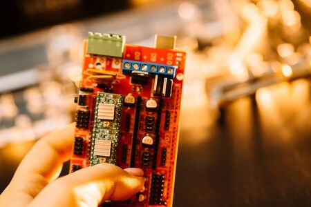 Detail of red electronic board. Close-up of electronic circuit board with SMD components and chip