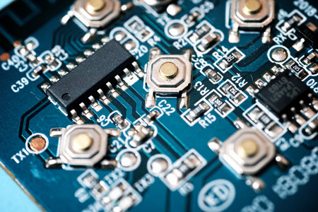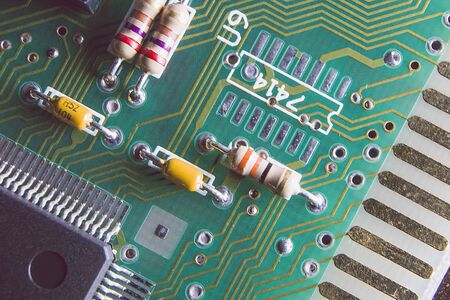 Macro shot of Circuit board with resistors microchips and electronic components. Computer hardware technology. Integrated communication processor. Information engineering. Semiconductor. PCB. Closeup