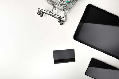 Online payment concept with shopping cart credit card and devices on white table. Top view. Horizontal composition.