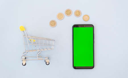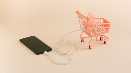 Shopping cart and mobile phone. Minimal concept of online shopping.