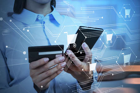 Businesswoman holding smartphone, typing numbers of credit card, double exposure row of baskets. Concept of online payment and delivery service