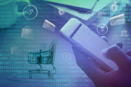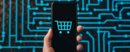 Hand holding smartphone with shopping cart icon against a digital circuit background, illustrating online shopping and technology.