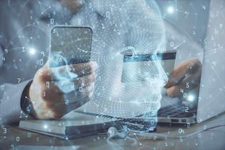 Double exposure of man hands typing on computer with credit card and brain theme drawing. E-commerce and AI concept.