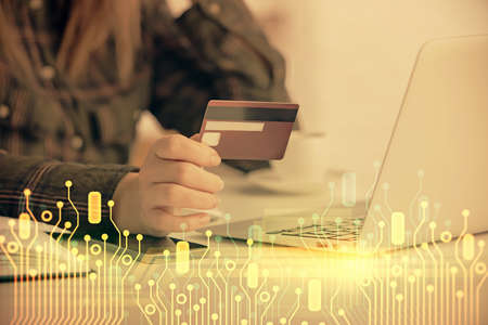 Double exposure of woman on-line shopping holding a credit card and data theme hologram drawing. E-commerce concept.