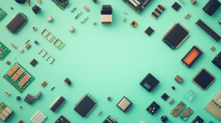 This image features a vibrant flat lay of various electronic components arranged artistically on a bright background, showcasing innovation and technology.